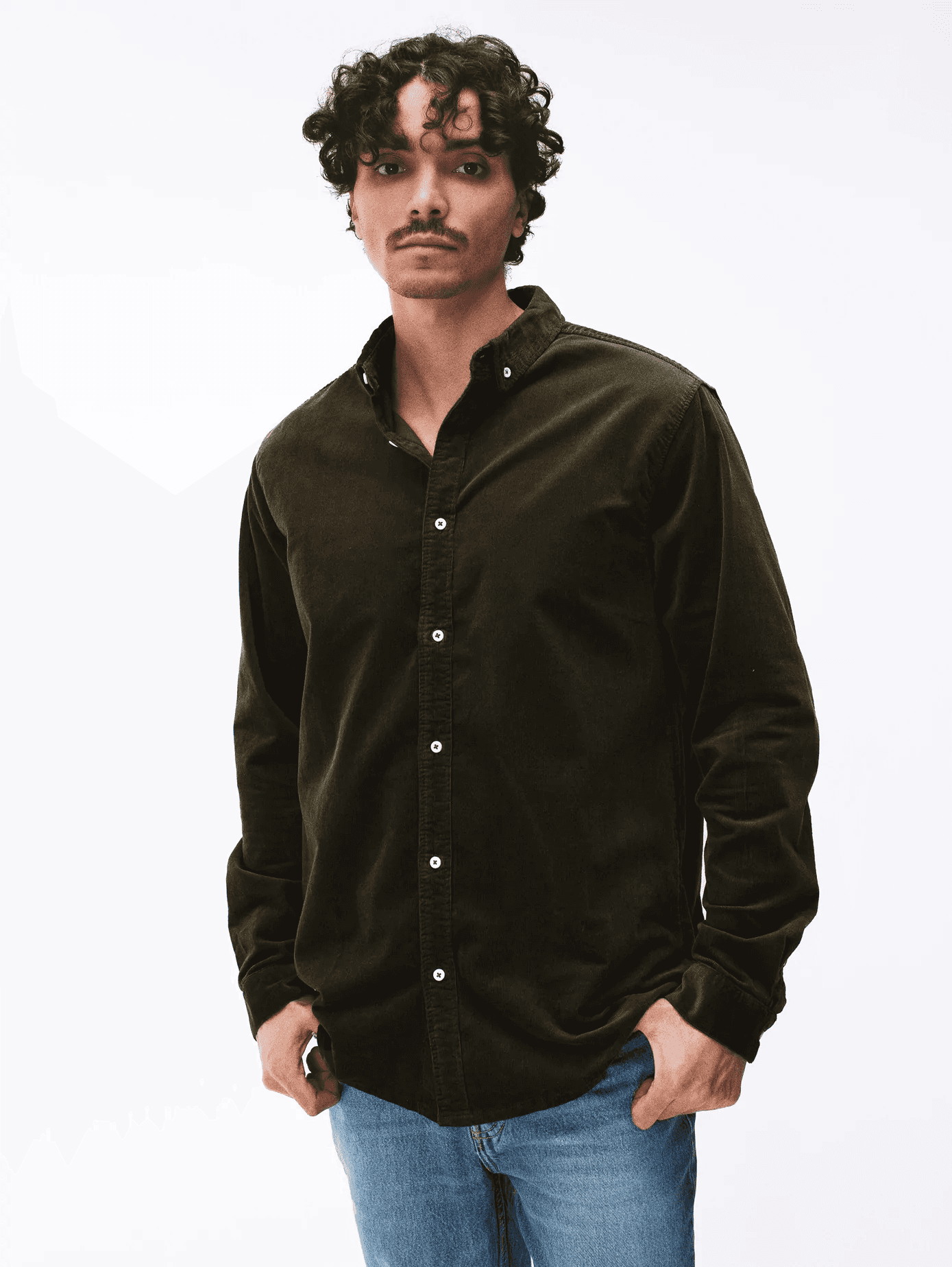 Contemporary unisex shirt made from certified organic cotton, featuring subtle detailing and signature Modura motif on cuff.